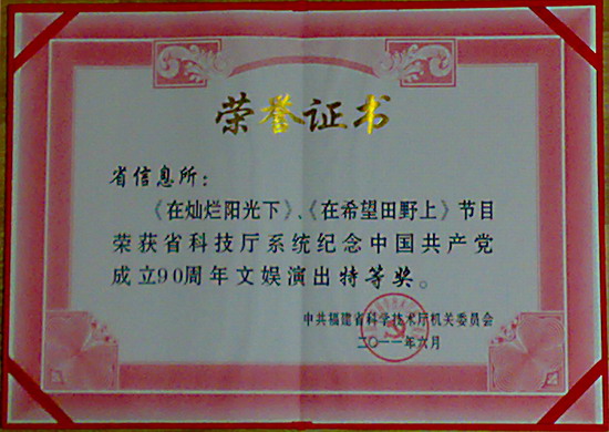 6月24日,省科技廳舉行了以“頌歌獻(xiàn)給偉大的黨”為主題的廳系統(tǒng)紀(jì)念中國共產(chǎn)黨成立90周年文娛演出活動(dòng)。我所選送的《滿城盡帶黃金甲》節(jié)目精彩紛呈、引人入勝,不時(shí)贏得在場觀眾的陣陣掌聲,最終獲得三等獎(jiǎng),大合唱《在希望的田野上》和《在燦爛的陽光下》作為壓軸節(jié)目,充分謳歌了黨領(lǐng)導(dǎo)人民建設(shè)國家的豐功偉績,激情而歡樂的歌聲久久回蕩大廳,更回蕩在每一個(gè)人心中,眾望所歸地獲得了特等獎(jiǎng)。