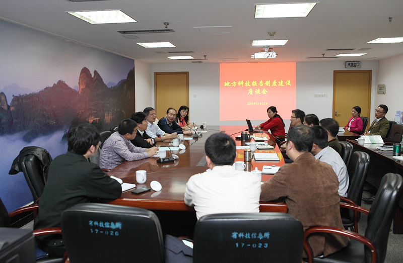 2014年11月21日下午,中國科技信息所張新民副所長、信息資源中心曾建勛主任和杜薇薇副研究館員一行3人蒞臨福建省科技信息所,參加省科技廳計劃處和省科技信息所共同組織的“地方科技報告制度建設工作座談會”,指導我省科技報告制度建設工作。省科技廳黨組副書記、副廳長張?zhí)烀,廳計劃處鄭怡彤處長、吳穎調研員和陳世明主任科員,省信息所高一真書記、李金算副所長、楊志鵬副所長、宋劍明總工及有關人員參加座談。