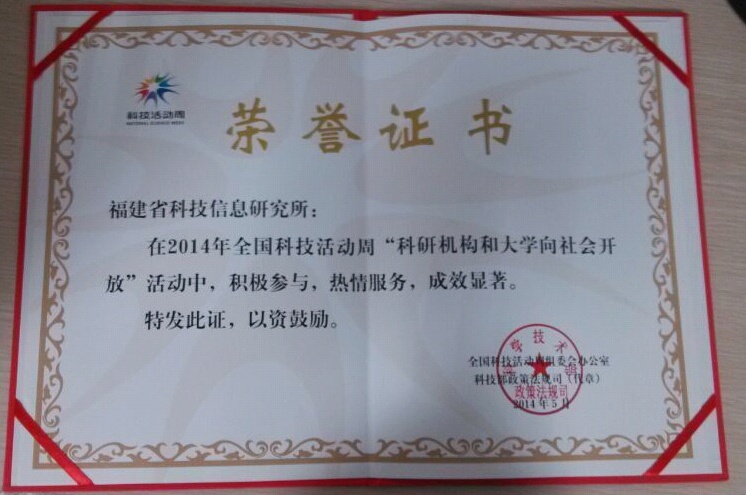 2014年5月17-24日全國舉辦了以“科學生活 創(chuàng)新圓夢”為主題科技活動周,在“科研機構和大學向社會開放”活動中,我所福建省臺灣文獻信息中心科技館積極響應組委會號召,將全館有關臺灣科技文獻資源以及其他相關文獻資源免費對外開放,熱情周到服務到館人員,獲得了全國科技活動周組委會辦公室一致好評并頒發(fā)榮譽證書。