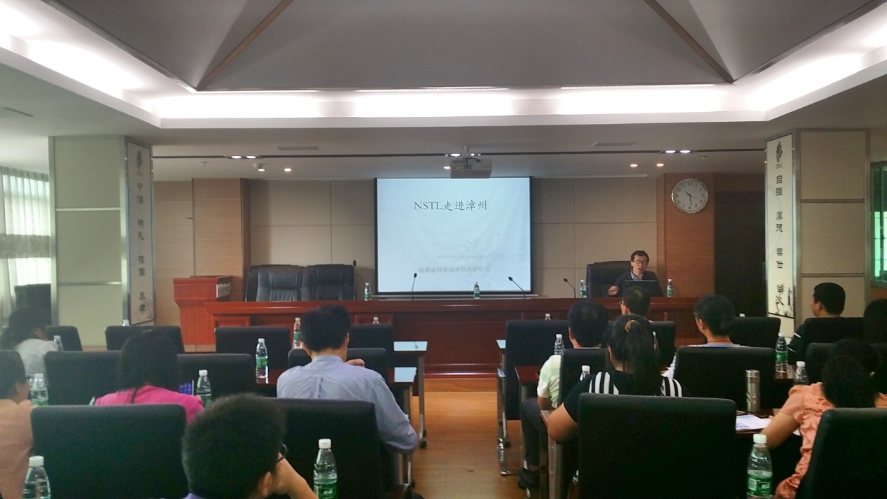 4月28日,文獻(xiàn)資源室與漳州市科技情報(bào)研究所共同舉辦 “NSTL及省所科技文獻(xiàn)資源應(yīng)用推廣”講座,李金算副所長與文獻(xiàn)資源室相關(guān)業(yè)務(wù)人員一行4人前往漳州,漳州各縣(市、區(qū))科技局和情報(bào)所人員及有關(guān)科研機(jī)構(gòu)和企業(yè)人員共40余人參加培訓(xùn)。漳州市科技局副局長蔡亞河主持講座,李金算副所長致辭。