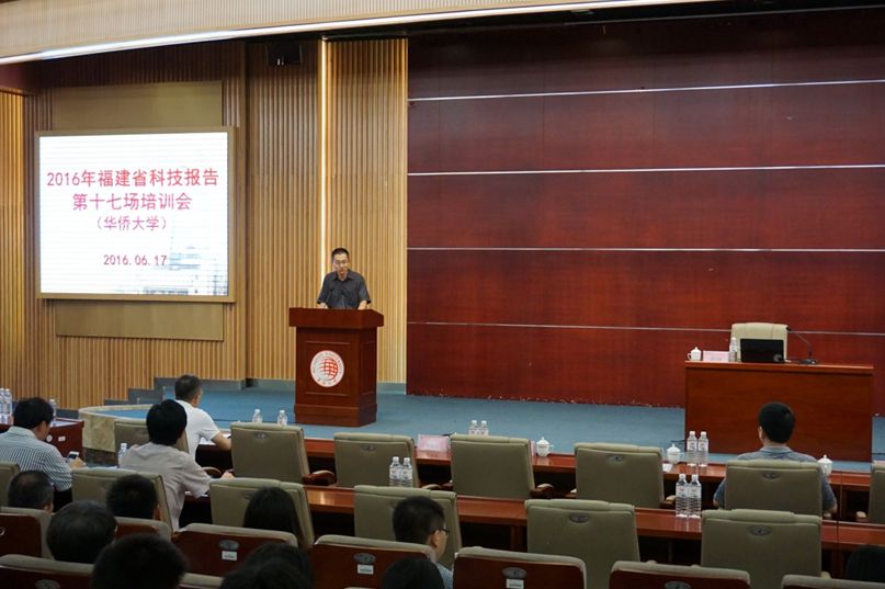 2016年6月17日,由省科技廳委托我所科技報(bào)告管理中心承辦的2016年福建省科技計(jì)劃項(xiàng)目科技報(bào)告第17場培訓(xùn)會在華僑大學(xué)舉行。來自華僑大學(xué)、泉州師范學(xué)院等泉州地區(qū)承擔(dān)省基礎(chǔ)研究和高校產(chǎn)學(xué)合作計(jì)劃項(xiàng)目的負(fù)責(zé)人和相關(guān)人員,以及各單位科管人員共310多人參加了培訓(xùn)會。培訓(xùn)會由華僑大學(xué)科研處副處長林繼志主持,省信息所宋劍明總工介紹了國家和福建省科技報(bào)告制度建設(shè)情況,對2016年省基礎(chǔ)研究和高校產(chǎn)學(xué)合作計(jì)劃項(xiàng)目科技報(bào)告推廣和培訓(xùn)工作進(jìn)行部署并提出了具體要求。省信息所文獻(xiàn)資源室苗軍主任就我省科技報(bào)告制度體系建設(shè)、科技報(bào)告撰寫、審查、呈交和共享作了專題講座,并與參會代表進(jìn)行了交流討論。